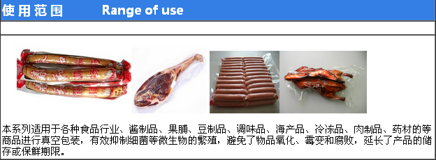 该机适 用如:肉类加工、酱腌产品、水产、海产品加工、蔬菜加工、农副产品加工、果脯、粮食、豆制品、药材、电器、化学制品等颗粒、粉状、液体等食品进行真空后充惰性气体包装、可以防止产品氧化霉变、腐败、防潮达到延长产品的储存期限。